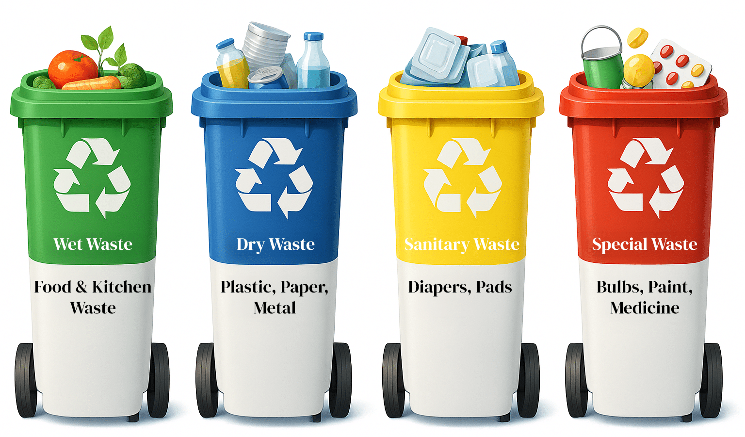 Every generator of waste—homes, businesses, hospitals, and airports must separate waste into Wet (food and organics), Dry (recyclables), Sanitary, and Domestic Hazardous streams. This step is crucial for effective recycling and safe disposal.