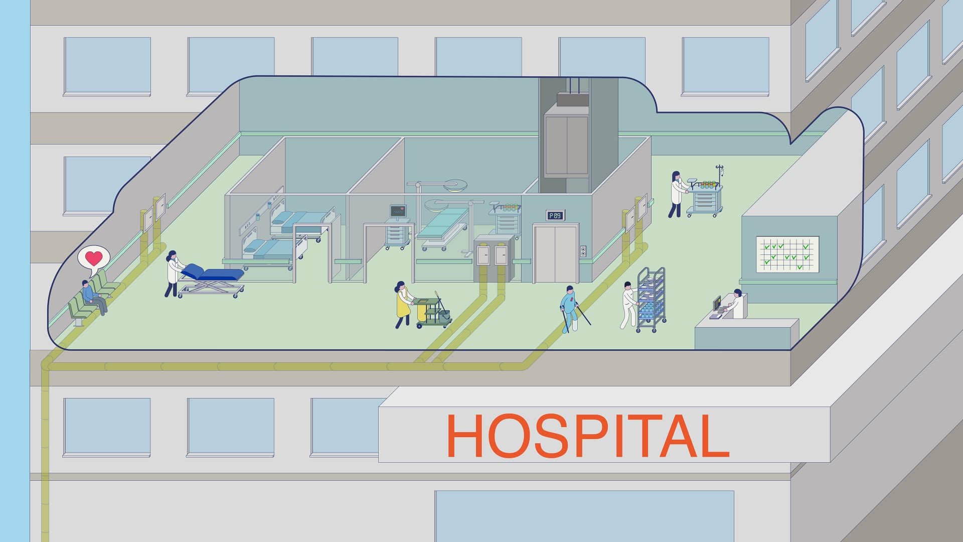 Improving hospital efficiency and hygiene by eliminating cross-infection risks and streamlining waste and soiled linen handling. Replacing wheel-based corridor transportation with our sealed and efficient vacuum transportation system will free up valuable space, improve workflow, and ensure a cleaner environment for patients and healthcare professionals.